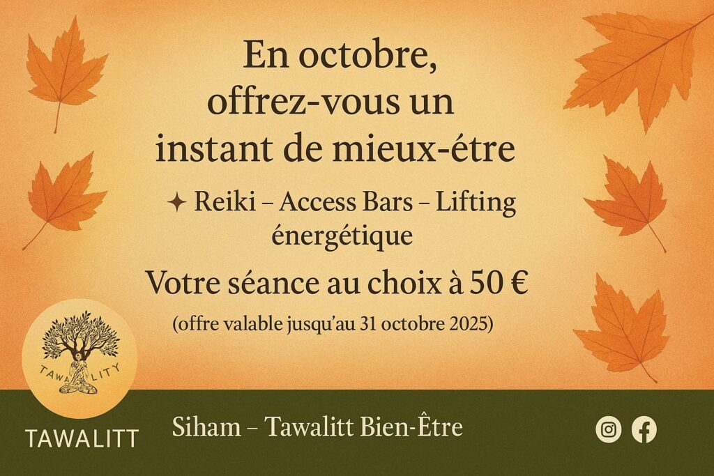 🍂 Octobre est le mois idéal pour ralentir et se recentrer. À travers le Reiki, les Access Bars ou le Lifting énergétique, je vous accompagne à : ✨ apaiser votre esprit, ✨ libérer vos tensions, ✨ retrouver équilibre et vitalité.